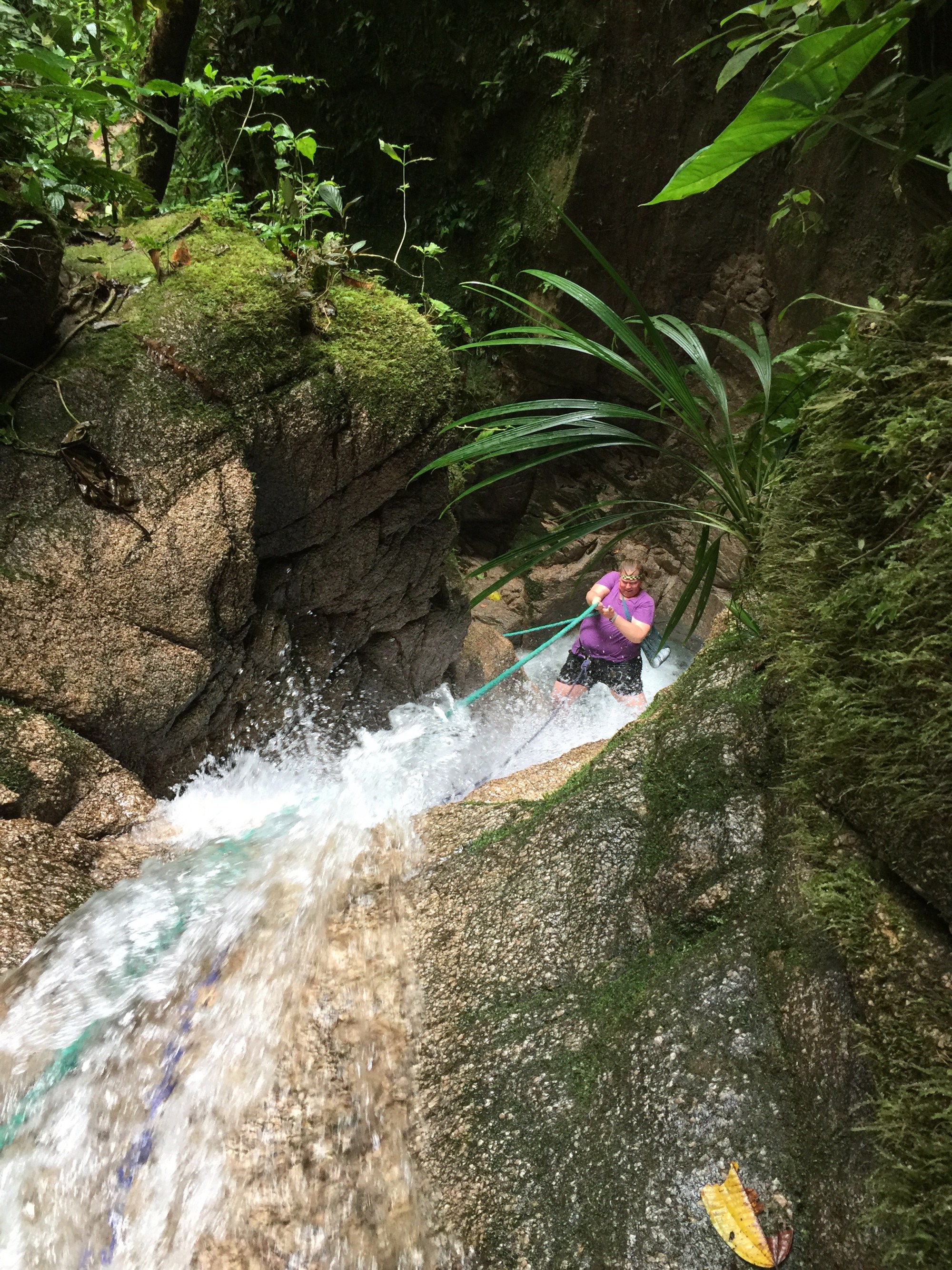 The hike included walking through and along a river, complete with a series of small waterfalls, and a precarious walk up a felled tree trunk. There were ropes to hang onto at times, but even so I found myself accepting help from my guides, something I almost never do because I’m too nervous that I’m going to hurt someone. Those mini obstacles were merely lead-in trials for the main challenge – ascending a 9 meter (27 feet) waterfall. I have never been so scared to do something in my life. I was the last to go, watching each person navigate the route to the top, or at least what I thought was the top as the rock outcropping obscured the top of the waterfall and left the final few meters a mystery. The guides asked if I wanted to use the harness. I sheepishly asked if it would fit, and thankfully it did.